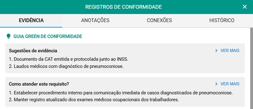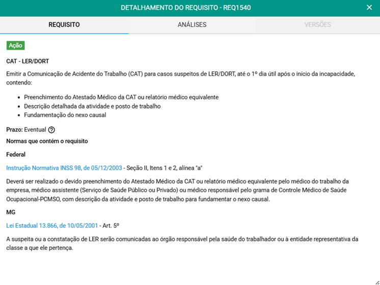 - Informação Pronta para Uso: Os requisitos legais são apresentados na plataforma de forma simplificada e contextualizada, indicando exatamente o que precisa ser feito na prática, sem a necessidade de ler e interpretar leis, decretos, INs complexos.